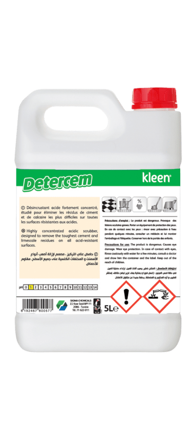 DETERCEM est un désincrustant acide puissant conçu pour éliminer efficacement les dépôts calcaires, le tartre et les incrustations sur les sols et surfaces en ciment. Sa formule concentrée agit en profondeur pour restaurer l’aspect d’origine des surfaces minérales et assurer une propreté durable. Adapté aux environnements professionnels et industriels, DETERCEM est un allié essentiel pour les travaux de remise en état et l’entretien régulier.
