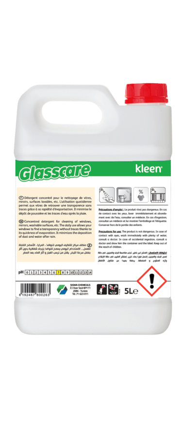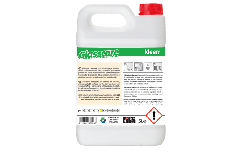 GLASSCARE est un nettoyant professionnel conçu pour les vitres, miroirs et toutes surfaces vitrées. Sa formule avancée dissout efficacement graisses, poussières et traces de doigts, garantissant une transparence parfaite. Son séchage rapide et son action anti-traces assurent une brillance longue durée. Facile à utiliser, GLASSCARE est l’allié idéal pour maintenir une propreté irréprochable dans tous les environnements professionnels.
