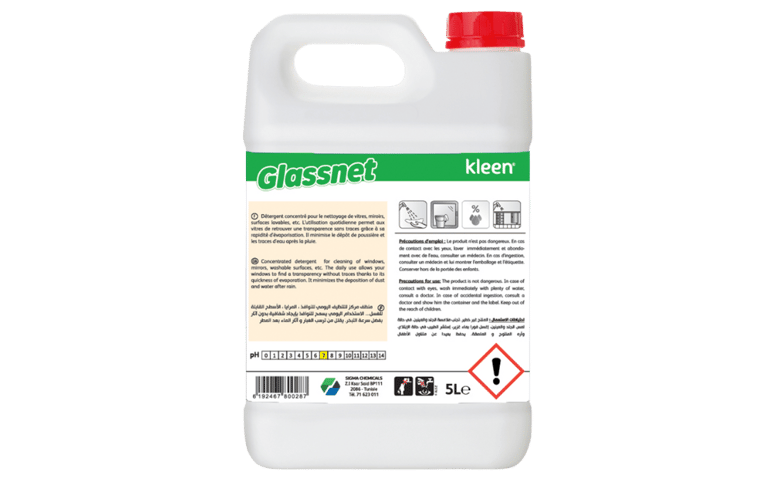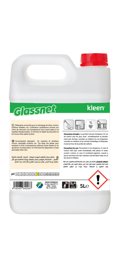 GLASSNET est un nettoyant professionnel spécialement conçu pour l’entretien des vitres, miroirs et surfaces vitrées. Sa formule efficace élimine rapidement poussières, traces de doigts, graisses et salissures, laissant une transparence éclatante et durable. Facile d’utilisation, GLASSNET assure un séchage rapide sans laisser de voile ni de traces, idéal pour un rendu impeccable dans tous les environnements professionnels.