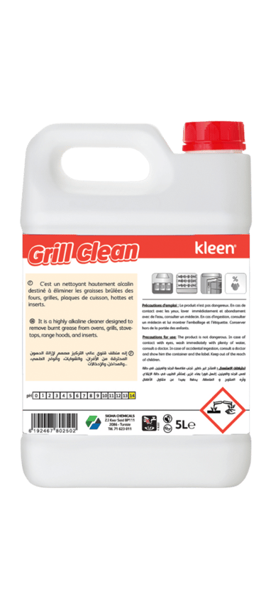 Grill Clean est un détergent alcalin à haute performance, conçu pour éliminer les graisses brûlées, huiles carbonisées et dépôts durcis. Grâce à sa forte teneur en agents pénétrants et dissolvants, il agit en profondeur et permet de dissoudre rapidement les résidus carbonisés sans effort mécanique important. Il évite ainsi l’usage intensif de grattoirs ou d’éponges abrasives, réduisant le risque d’endommager les surfaces.
