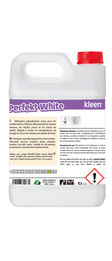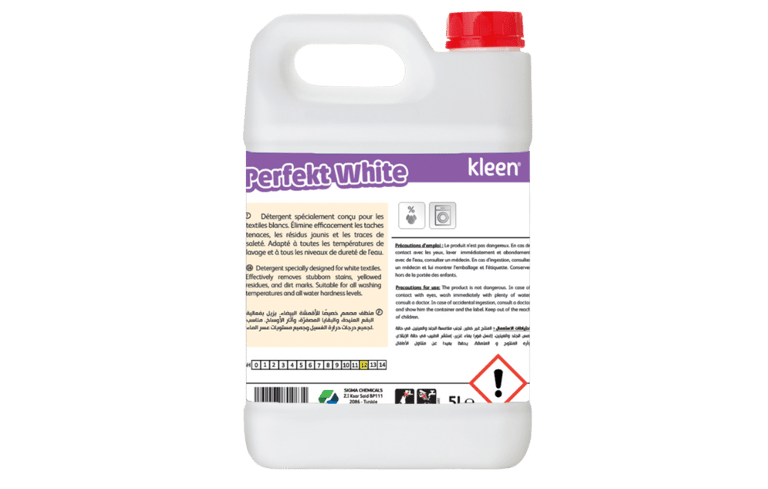PERFEKT WHITE est un détergent professionnel spécialement formulé pour l’entretien des textiles blancs. Sa formule concentrée élimine les taches, empêche le voile gris et redonne éclat et luminosité au linge. Idéal pour un usage intensif, PERFEKT WHITE conserve la blancheur et la fraîcheur des draps, serviettes et uniformes, garantissant une hygiène parfaite et durable.