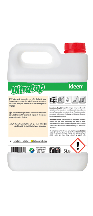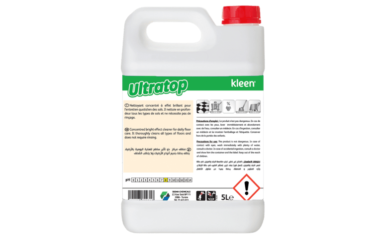 ULTRATOP est un détergent neutre spécialement conçu pour l’entretien des sols. Sa formule professionnelle assure un nettoyage efficace tout en laissant un effet brillant durable. Idéal pour les environnements à forte fréquentation (bureaux, hôtels, commerces), il respecte les surfaces et laisse une agréable sensation de propreté.